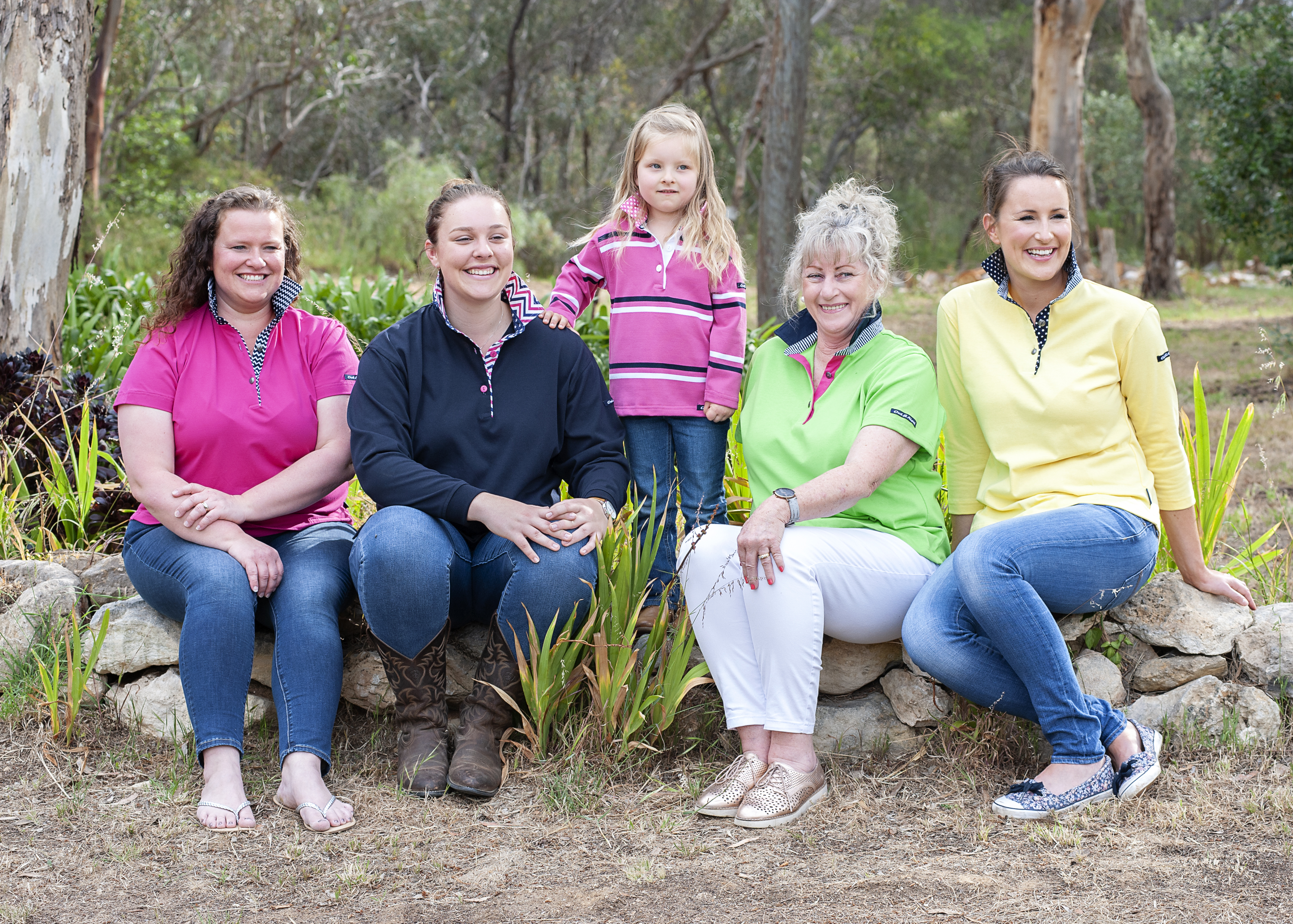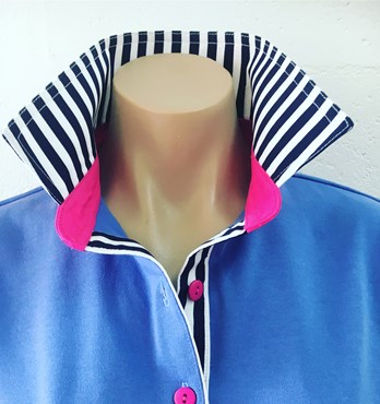 Out & About Clothing creates a colourful collection of women and kids rugby tops, all with bright contrasting collars and trims.