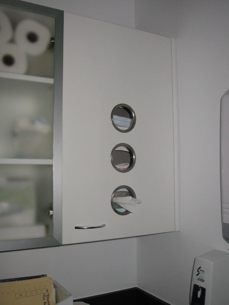 Professional hideaway style paper towel dispenser installed into the rear of wall mounted cabineted.